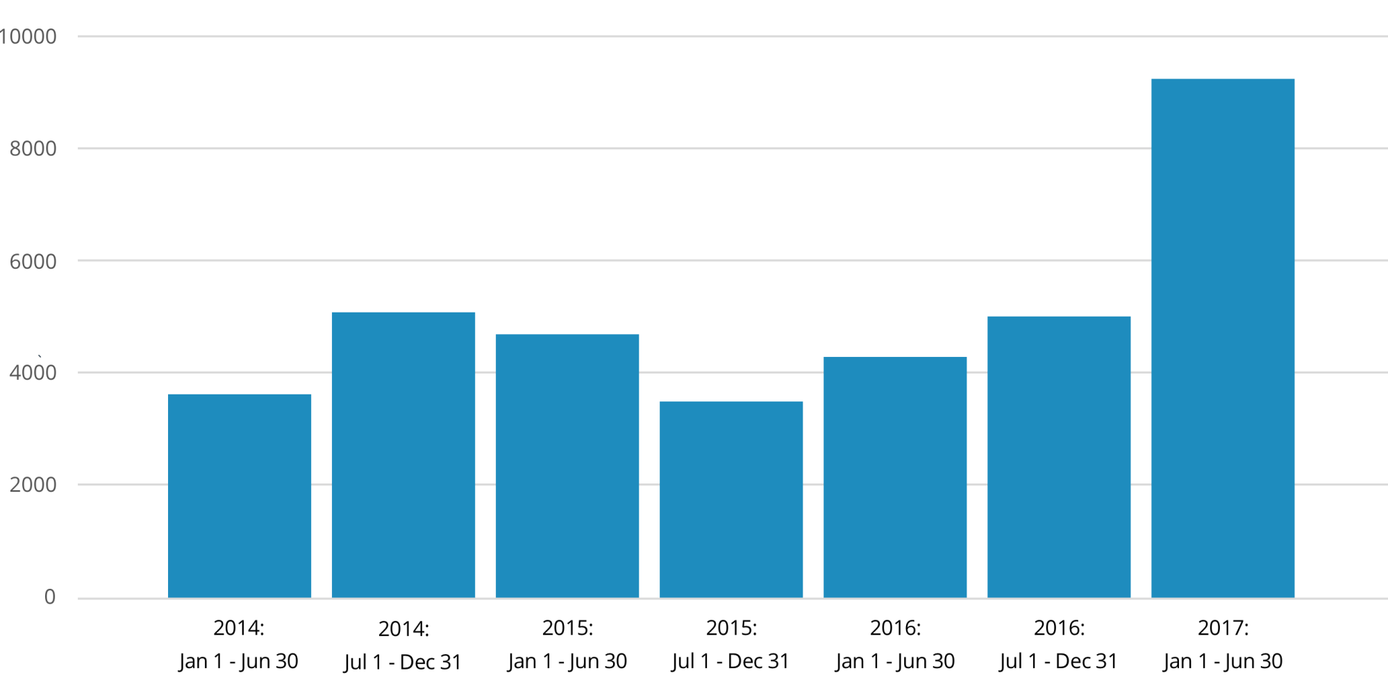 We received the highest number of DMCA takedown notifications in a single six-month reporting period. From the 5,006 we received between July-December 2016 to 9,273 this period, we saw an 85% increase.
