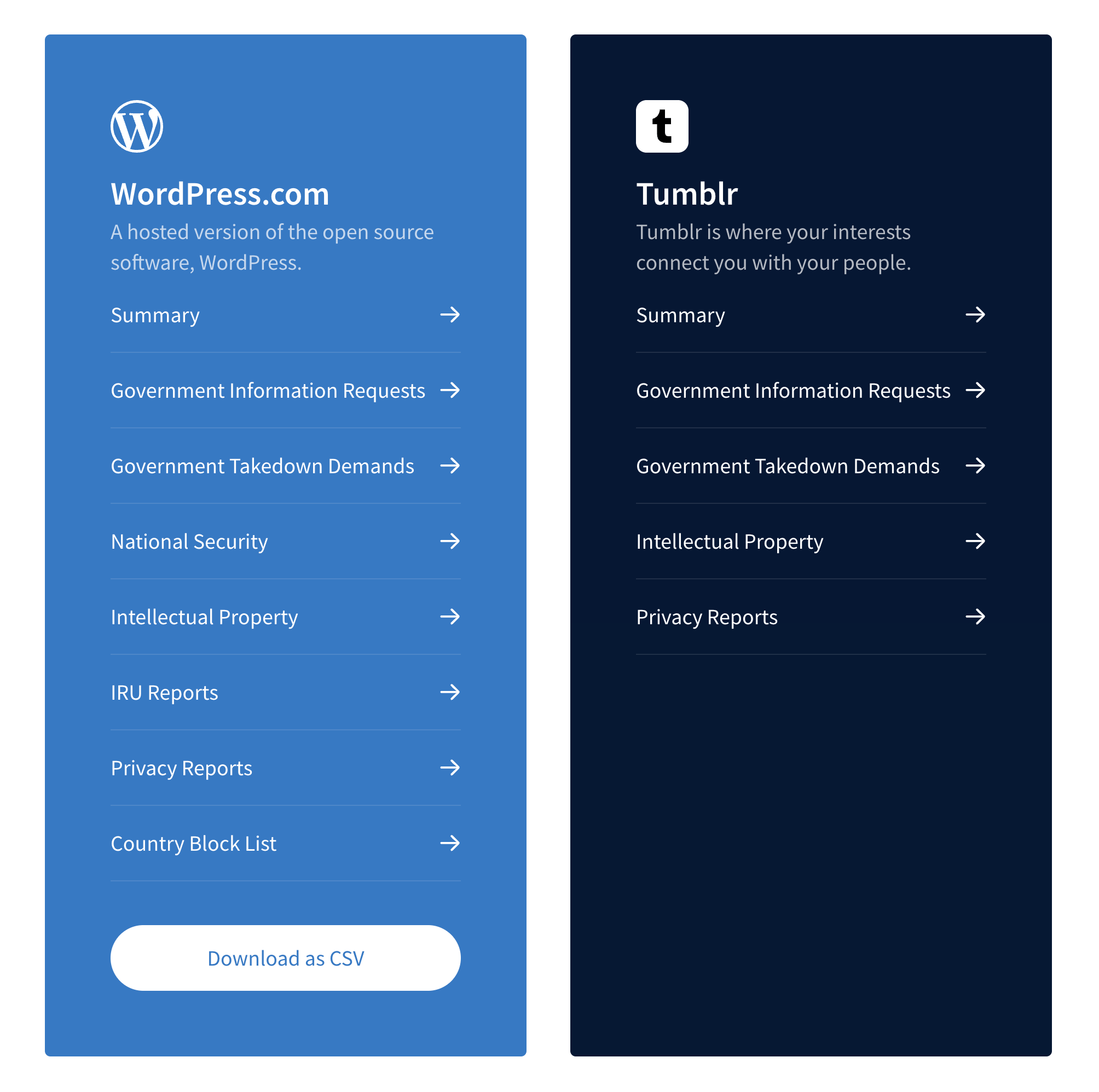 There are still some differences in the presentation of our data for each platform, but we’ve opted for additional changes this round to make comparing numbers a bit easier. Specifically, while you’ll only find data on National Security Letters, IRU Reports, and our Country Block List for WordPress.com, the titles of the following categories have been aligned for both WordPress.com and Tumblr: